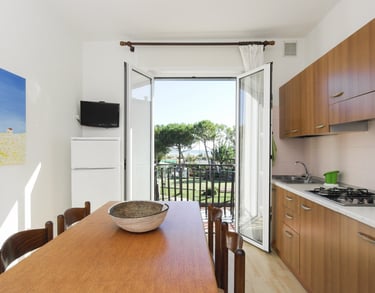 Tra gli alloggi ci sono appartamenti, moderni e confortevoli, rinnovati di recente e arredati con colori vivaci che creano un' atmosfera accogliente, per garantire la massima tranquillità a chi sceglie di trascorrere la vacanza insieme a noi.